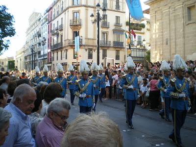 Estos uniformados son la policía Municipal con traje de Gala, que siempre desfile tras la autoridad municipal, también es tradicional su presencia en esta festividad. Aunque no sabemos por qué no desfila la Compañía al completo. Iban menos de los que son. De todas formas este año ha desfilado mas que el pasado año.
