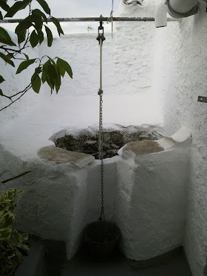 Si la extensión de la parte trasera de la casa lo permitía, se habilitaba un pequeño huerto donde se podía sembrar alguna que otra hortaliza, que naturalmente era aprovechada en la cocina. No faltaba el perejil y la hierbabuena, tan simples y tan necesarios en muchos platos típicos. A veces había elementos inservibles que se situaban en un rincón y se aprovechaban como pequeños complementos decorativos. Como podemos ver aquí. Una olla grande, que ya dio su utilidad, se blanquea con cal, se deja en un lugar del patio y nos queda un bonito y curioso objeto de adorno.